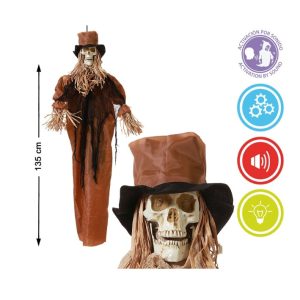C79305 – Espantalho Castanho 135cm, com luz, movimento e som, para pendurar. Artigo de fabrico RPC. Alimentado com 3 pilhas do tipo AA. Pilhas não incluÃ...