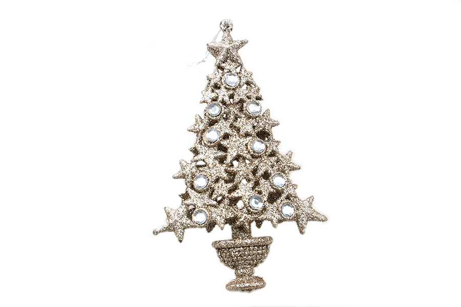 L01010 – Árvore Natal Champanhe 16cm, para pendurar, pack 1un. Feito em plástico pintado. Artigo de fabrico RPC/Itália. A Árvore Natal Champanhe 16cm juntamente com as bolas de natal confere à decoração um ar muito encantador, principalmente quando colocado nos pinheiros de natal. Ideal para ser utilizado com o veado branco, gnomos ou com o pai natal. Amplamente utilizado em decorações natalícias juntamente com a cerca de madeira com neve e também em festas infantis cujo tema são os doces.