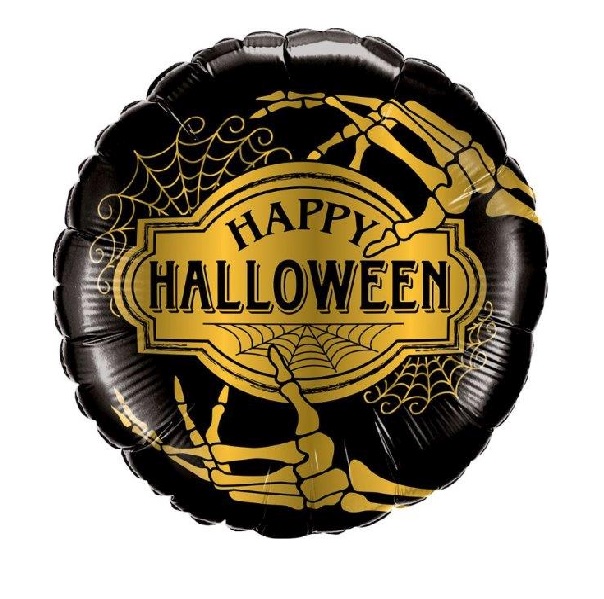 BQ58150 – Balão Foil Happy Halloween 18”, altura 46cm, redondo. Artigo de fabrico USA da marca QUALATEX. Artigo muito utilizado em decoração de festas, principalmente de halloween.