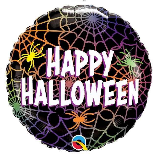 BQ14997 – Balão Foil Happy Halloween aranhas 18”, altura 46cm, redondo. Artigo de fabrico USA da marca QUALATEX. Artigo muito utilizado em decoração de festas, principalmente de halloween.