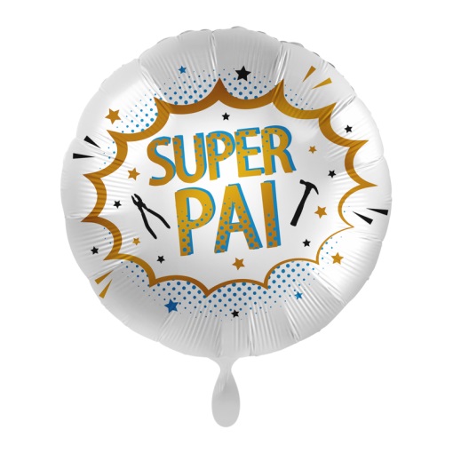 BGE81081 – Balão Foil Redondo “Super Pai” 17, feito em foil, diâmetro 43 cm, 17”, biodegradável, pack 1un. Pode ser enchido com gás hélio (para subir) ou a ar (no chão). Artigo de fabrico Alemanha da marca PREMIOLOON. Artigo muito utilizado em decoração de festas, principalmente no dia da mãe ou em festas temáticas.