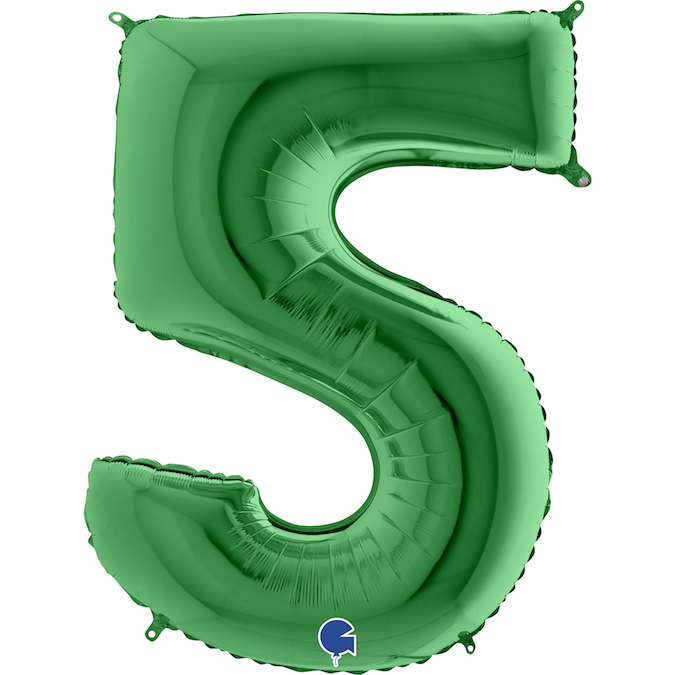 BG035GR40 – Balão Foil VERDE Número 5, 1 un, 40”, altura 102 cm, foil, biodegradável, reutilizável. Pode ser enchido com gás hélio (para subir) ou a ar (no chão). Artigo de fabrico italiano da marca GRABO. Artigo muito utilizado em decoração de festas, principalmente no dia de aniversário infantil ou em festas temáticas.