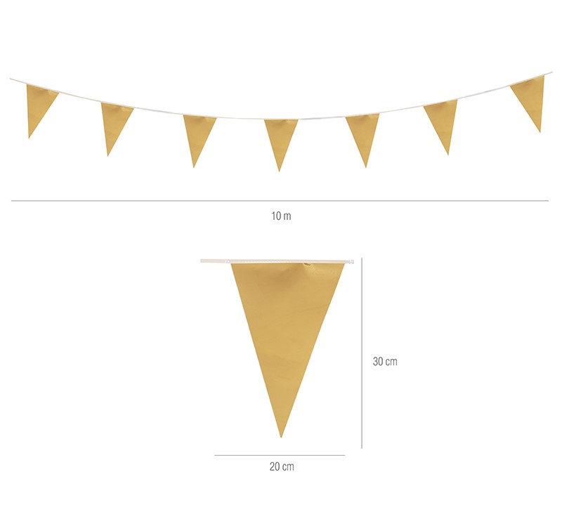 B7256 – Bandeira Triângulos metálica Dourada, lisa, comprimento 10 metros. Dimensões dos triângulos: comprimento 20cm, altura 30cm. Artigo de fabrico RPC, Espanha. Artigo muito utilizado em decoração de festas, principalmente infantis. Também pode ser utilizado em festas temáticas, nomeadamente: frozen, mickey, homem aranha, minnie, princesas e muitos outros temas.