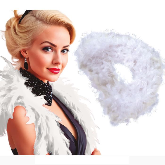 C16343 – Boá Penas Brancas 1.80m, feito em penas, da cor branca, comprimento 1.80m, peso 40g, 1 unidade. Artigo de fabrico RPC. É certamente a opção mais indicada para quem quer completar a sua fantasia de anos 20. Também pode ser utilizado em festas cujo tema são as profissões. Juntamente com o vestido e a cigarrilha, o figurino fica completo. De maneira idêntica a Boá Penas Brancas 1.80m também pode ser utilizado como acessório de carnaval. Também pode ser utilizada de modo a criar cenários, tais como cenários de ensaios fotográficos, peças de teatro, mas é principalmente utilizado para fantasias. A Boá Penas Brancas 1.80m pode ser usado juntamente com outros artigos, nomeadamente: copos, pratos, guardanapos e outras decorações alusivas ao tema da festa.