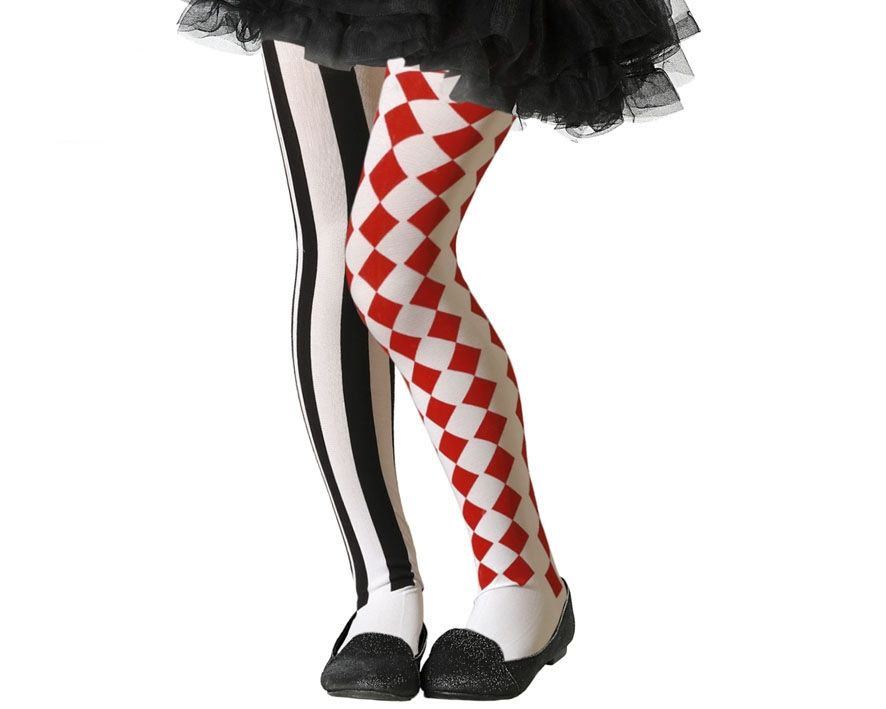 C80076 – Collants Pretas Riscas Losangulos Criança 8/12 anos (130-145cm), riscas brancas e pretas, losangulos brancos e vermelhos, pack 1un. Artigo de fabrico RPC/Espanha.