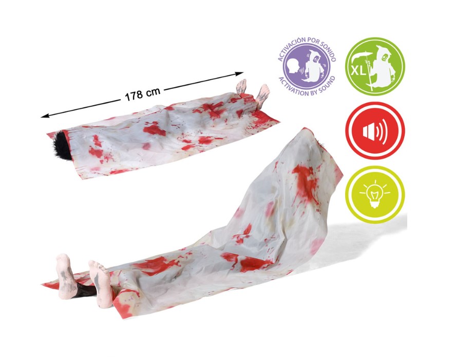 C74845 – Corpo Cortina Sangue 180cm, com luz, movimento e som. O Corpo Cortina Sangue 180cm tem 2 tipos de funcionamento: com botão de pressão e sensor de som Artigo de fabrico RPC. Alimentado com 3 pilhas do tipo AA. Pilhas não incluídas. Artigo muito utilizado em decoração de festas, principalmente de halloween.