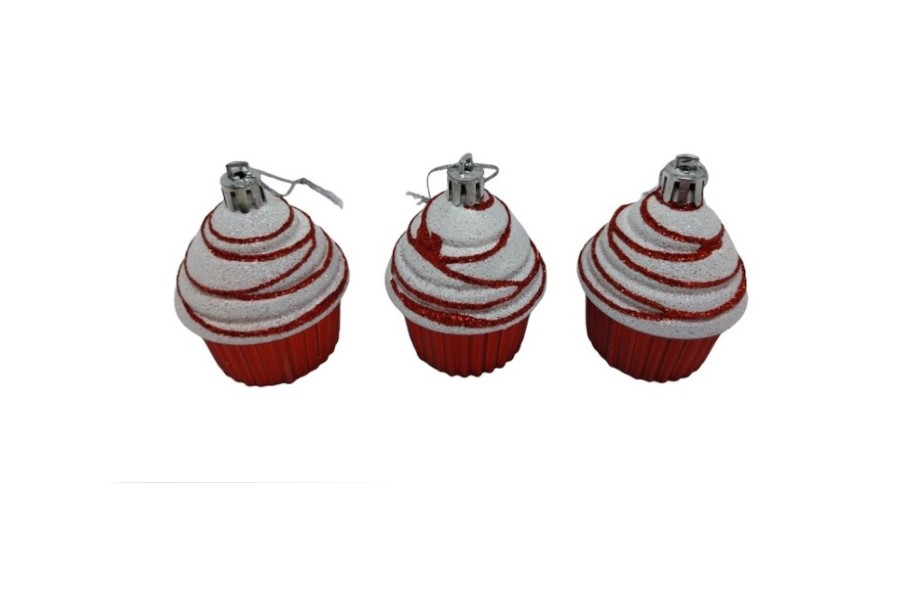 L62534 – Cupcake PVC Branco Vermelho 7cm, comprimento 5cm, altura 7cm, pack 3un. Feito em PVC. Artigo de fabrico RPC/Itália. O Cupcake PVC Branco Vermelho 7cm juntamente com as bolas de natal confere à decoração um ar muito encantador, principalmente quando colocado nos pinheiros de natal. Ideal para ser utilizado com o veado branco, gnomos ou com o pai natal. Amplamente utilizado em decorações natalícias juntamente com a cerca de madeira com neve e também em festas infantis cujo tema são os doces.