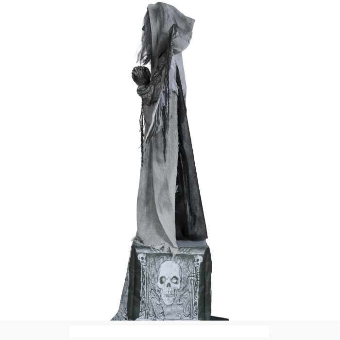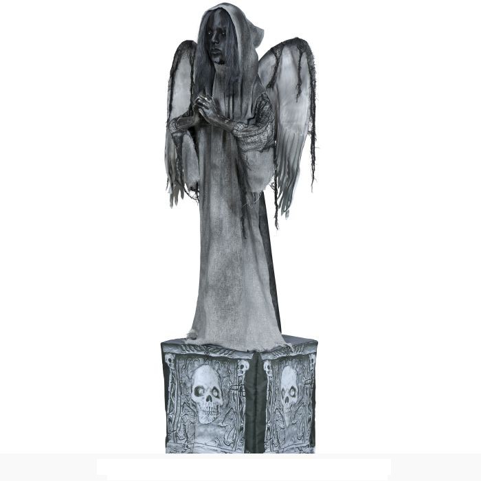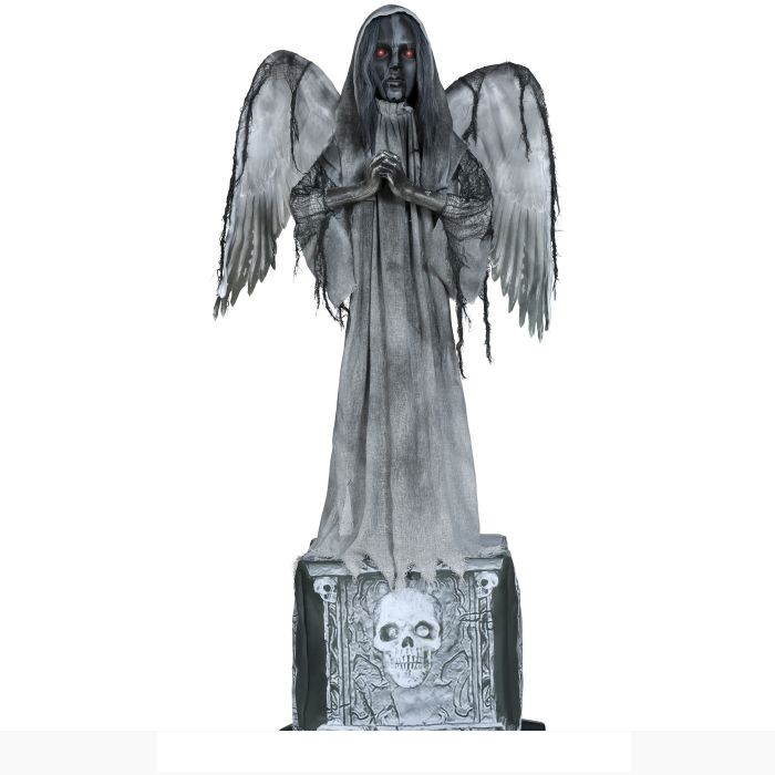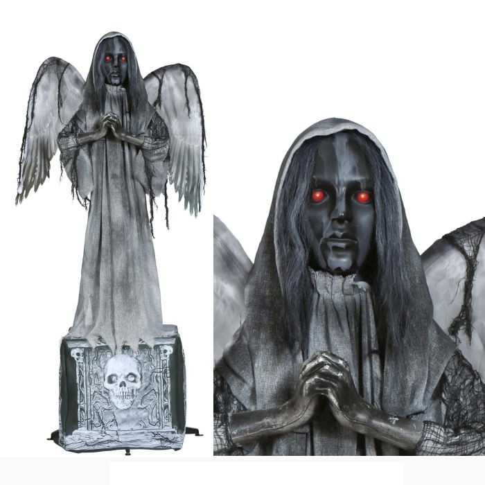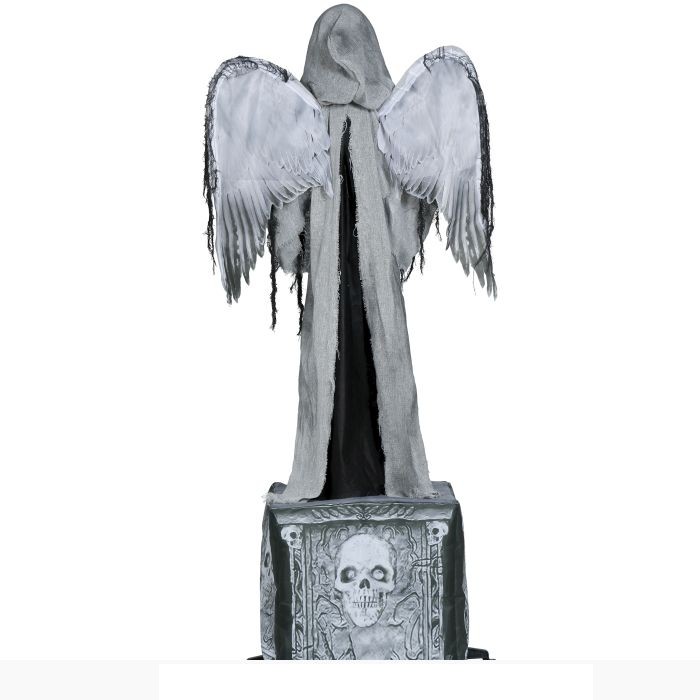 C24851 – Esqueleto Anjo da Morte com movimento, luz e som, altura 170cm com suporte para chão. Possui botão para ligar/desligar e sensor de som. Artigo de fabrico RPC. Artigo muito utilizado em decoração de festas, principalmente de halloween.