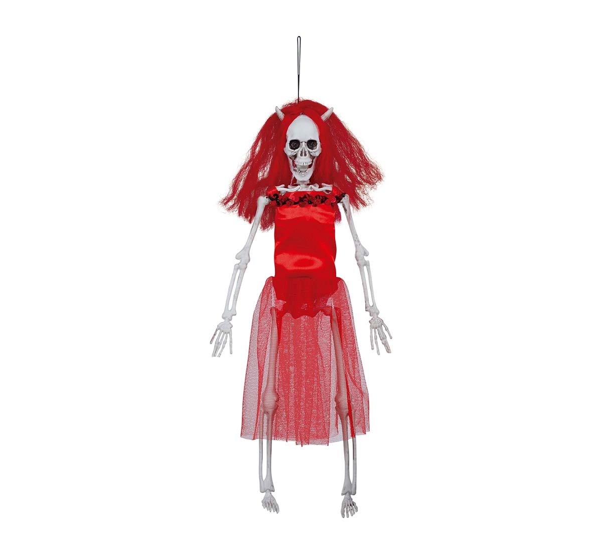 C24008 – Esqueleto Diaba Noiva 40cm, para pendurar, altura 40 cm, feitos em plástico. Artigo de fabrico RPC. Artigo muito utilizado em decoração de festas, principalmente de halloween.