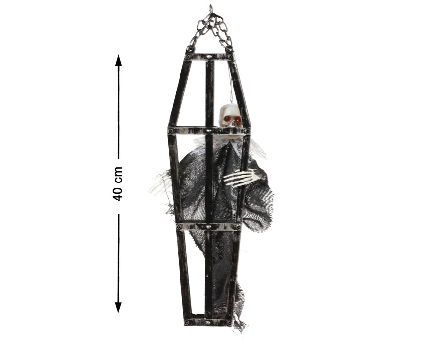 C79433 – Esqueleto Enjaulado Cinzento, para pendurar com as dimensões: altura 40cm e comprimento 13cm. Artigo de fabrico RPC. Artigo muito utilizado em decoração de festas, principalmente de halloween.