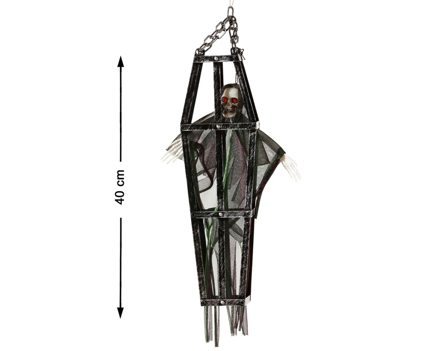 C79431 – Esqueleto Enjaulado Preto, para pendurar com as dimensões: altura 40cm e comprimento 13cm. Artigo de fabrico RPC. Artigo muito utilizado em decoração de festas, principalmente de halloween.