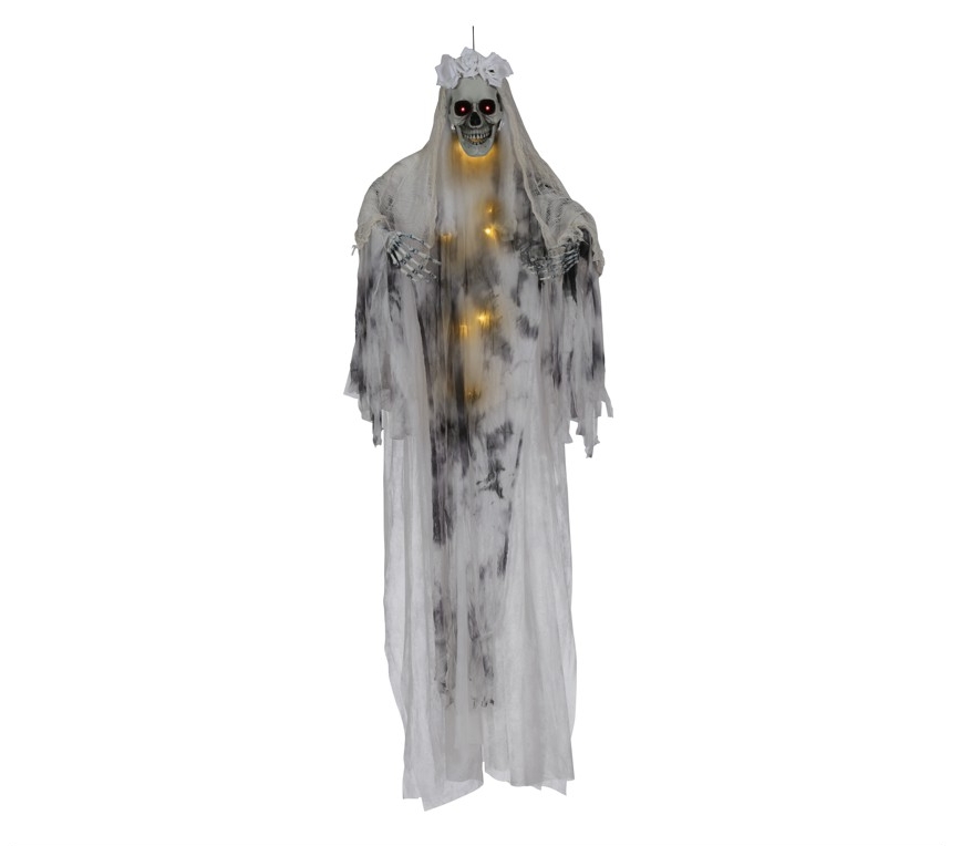 C26511 – Esqueleto Fantasma Noiva 180cm, com luz, para pendurar, altura 180 cm, feito em plástico e TNT/rafia. Artigo de fabrico RPC. Artigo muito utilizado em decoração de festas, principalmente de halloween.