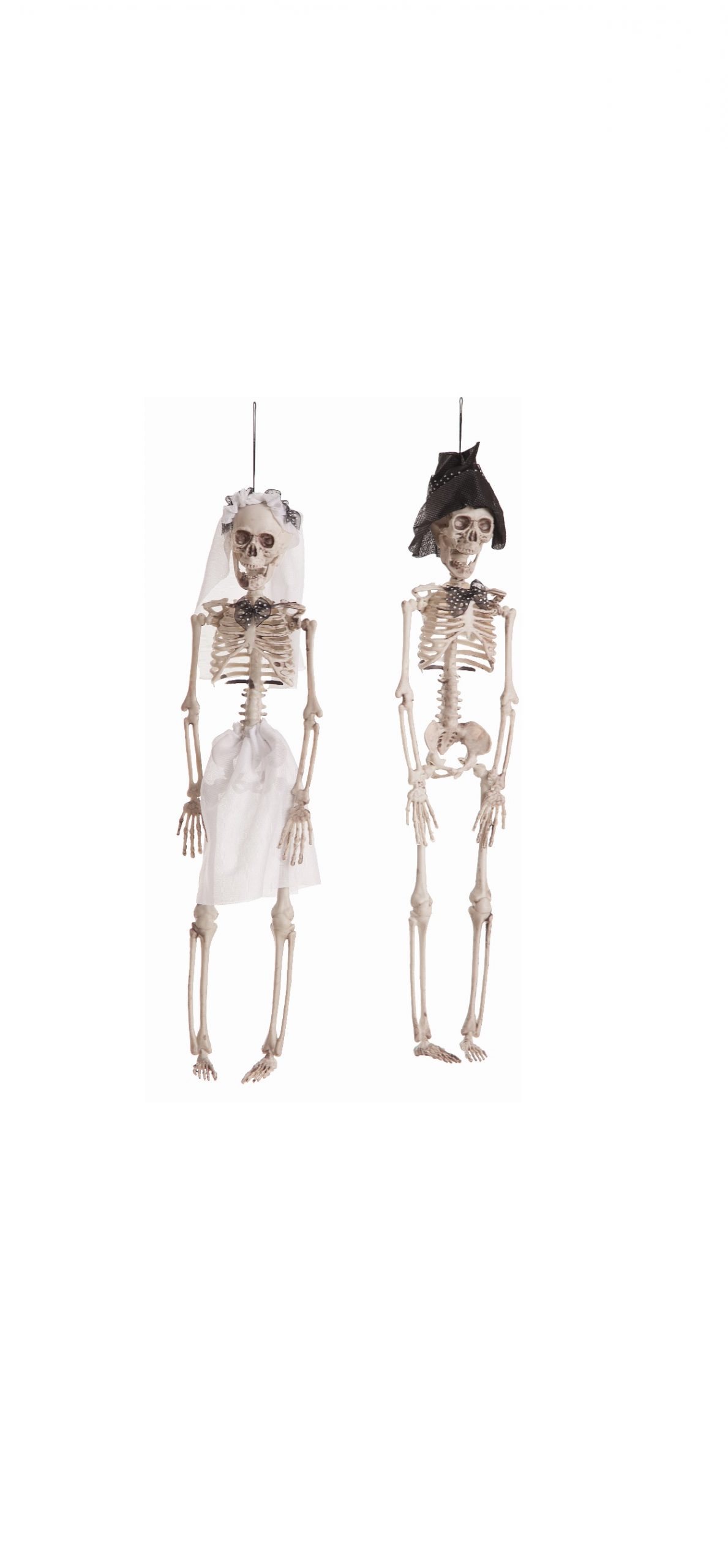 C5980 – Esqueleto Noivos 40 cm, para pendurar, altura 40 cm, feitos em plástico e tecido/TNT. Disponível 2 modelos: noivo e noiva. Preço por unidade. Artigo de fabrico RPC. Artigo muito utilizado em decoração de festas, principalmente de halloween.