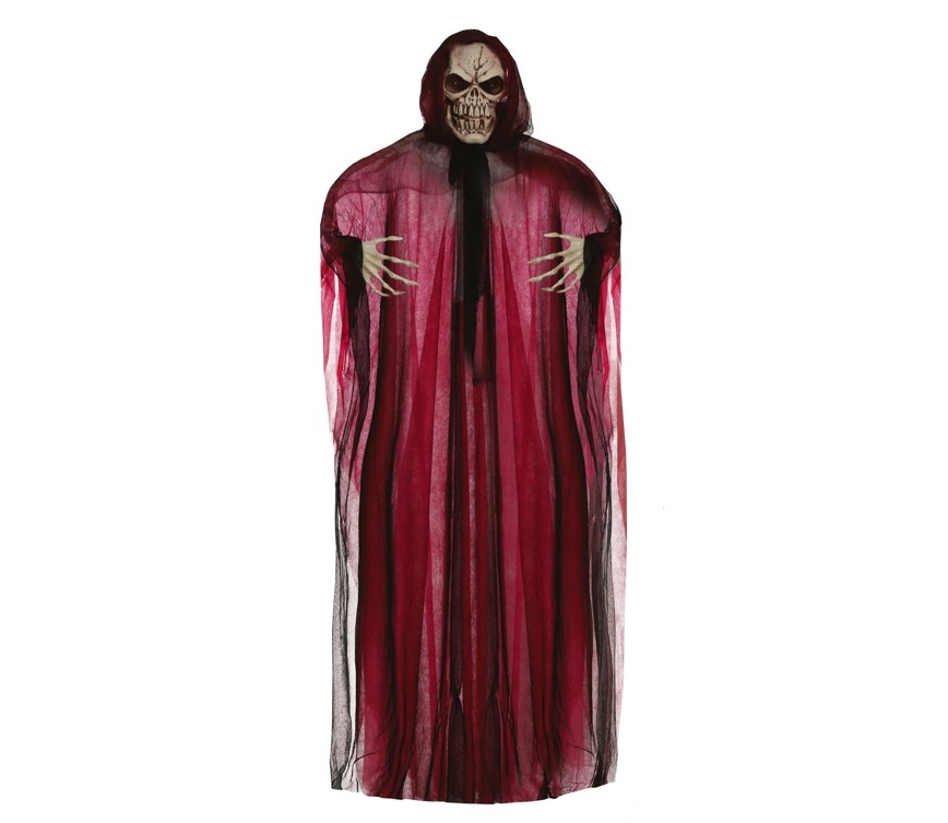 C26546 – Esqueleto túnica cor sangue 200 cm, suporte para chão, com luz e som, altura 200 cm. Feito em plástico e TNT/poliester. Artigo de fabrico RPC. Artigo muito utilizado em decoração de festas, principalmente de halloween.