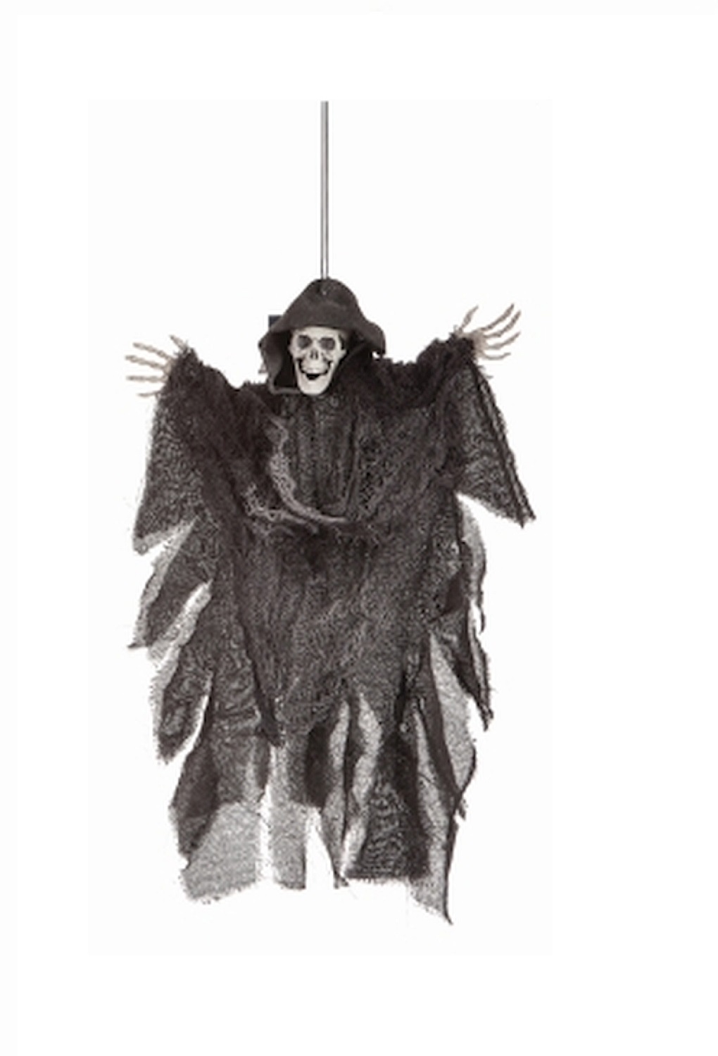 C5505 – Esqueleto túnica rafia preta 50cm, para pendurar, altura 50 cm, feitos em plástico e TNT. Artigo de fabrico RPC. Artigo muito utilizado em decoração de festas, principalmente de halloween.