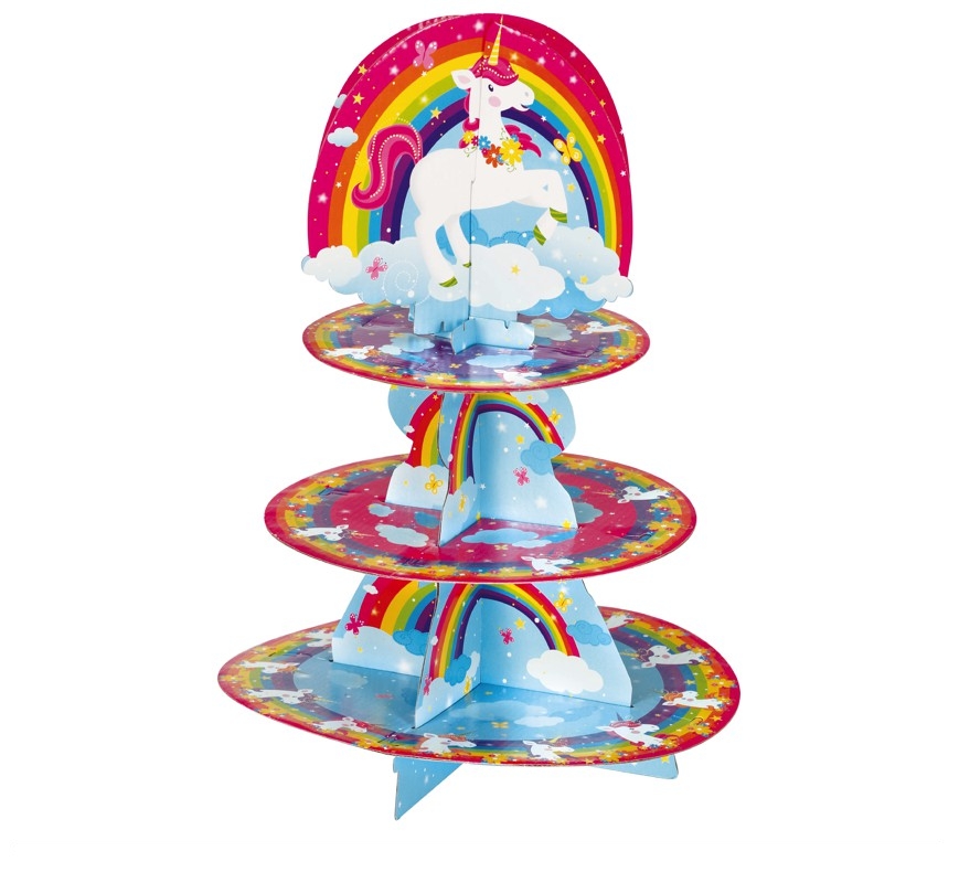 B7230 – Expositor Papel cupcakes Unicórnio, 3 andares, comprimento 30 cm, altura 40 cm, feito em papel, reciclável. Artigo de fabrico RPC. Artigo muito utilizado em decoração de festas, principalmente infantis. Também pode ser utilizado em festas temáticas, nomeadamente: unicórnio, frozen, mickey, homem aranha, minnie, princesas e muitos outros temas.