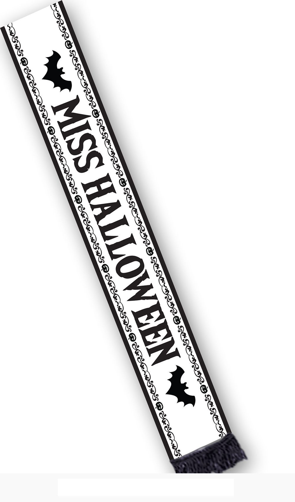 C31514 – Faixa Adulto “Miss Halloween”, feito em cetim branco com letras pretas, pack 1 un. Artigo de fabrico RPC/Espanha. Artigo muito utilizado em decoração de festas, principalmente de halloween.