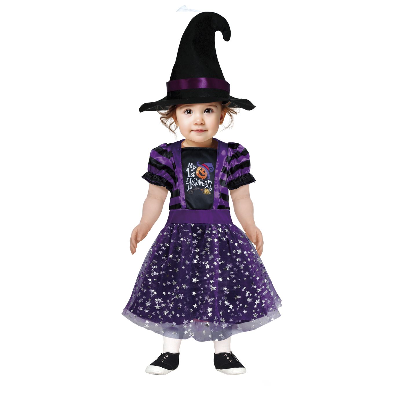 C76140 – Fato Bruxa Roxa bebe 12/18 meses, criança. Inclui vestido e chapéu, mas não inclui collants. Artigo de fabrico RPC/Espanha.