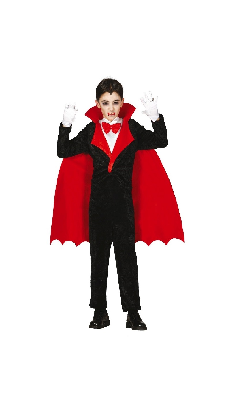C83115- Fato Conde Vampiro 7/9 anos, criança. Inclui fato completo, capa e camisa. O bastão deve ser adquirido à parte. Artigo de fabrico RPC/Espanha.