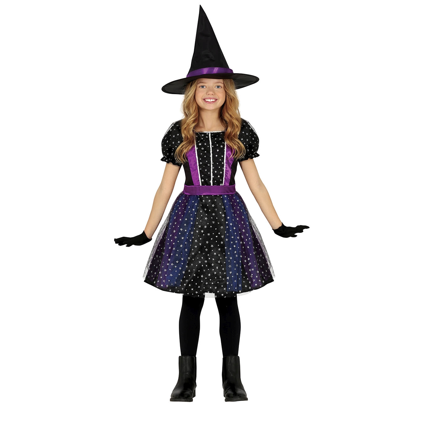 C78085 – Fato de Bruxa Estrela Roxa menina 3/4 anos, criança. Inclui vestido e chapeu, mas a vassoura e os collants devem ser adquirida à parte. Artigo de fabrico RPC/Espanha.