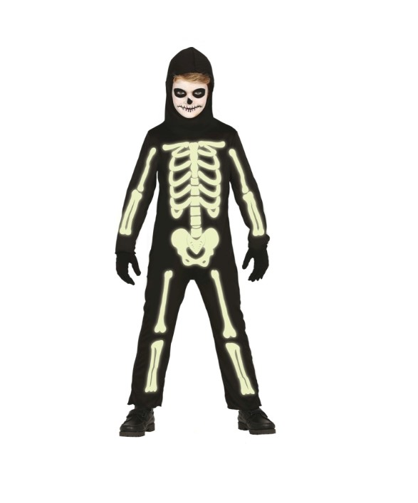 C87313 – Fato Esqueleto Glow menino 10/12 anos. Inclui fato completo com capuz. As luvas devem ser adquirido à parte. Artigo de fabrico RPC/Espanha.