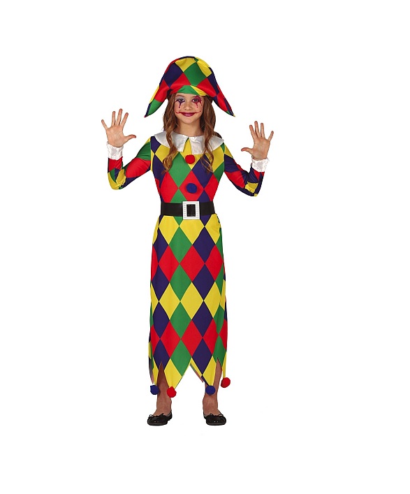 C83643 – Fato Harlequim menina 10/12 anos, criança. Inclui vestido, gorro e cinto, mas as bolas de malabarismo devem ser adquiridas à parte. Artigo de fabrico RPC/Espanha. É certamente a opção ideal para utilizar artigos alusivos ao tema circo, tais como: palhaços, descartáveis, tendas de circo, entre outros…