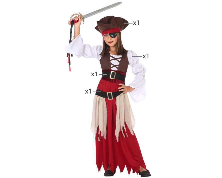C56962 – Fato menina Pirata 10/12 anos, inclui o vestido, chapéu e 2 cintos. Não inclui espada nem tapa olhos. Medidas: busto 75-81 cm, cintura 66-70 cm, ancas 81-87 cm, altura 145-160 cm. Artigo de fabrico RPC/Espanha. É certamente um artigo indispensável em festas, principalmente em infantis. Também pode ser utilizado em festas temáticas, nomeadamente: piratas. Analogamente também é um fato importante no Carnaval para as meninas cujo desejo é o de serem personagem de filme por um dia.