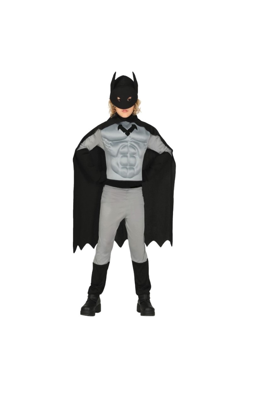 O Fato menino Homem-Morcego Musculado cinzento 5/6 é um fato feito em tecido muito utilizado pelos meninos nas festas. Também está disponível fatos de príncipe para meninos. Semelhantemente, as crianças quer sejam meninas, quer sejam meninos também se podem mascarar de outras princesas e príncipes. Do mesmo modo, a festa fica completa quando a mesa fica totalmente composta se adicionarmos os pratos, copos e guardanapos do tema. Com a finalidade de se proporcionar uma maior abordagem ao tema, pode-se utilizar o balão latex cinzento. De maneira idêntica, pode-se acrescentar algumas decorações tais como topers de homem morcego em cartão, entre outros.