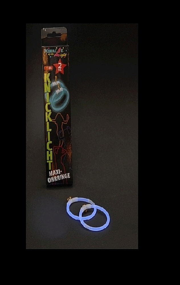 B12116 – Glow Brincos Grandes Azuis, caixa com 2 un. Ideal para festas. Duração do brilho até 8 horas. Artigo de fabrico RPC/Alemanha. É sem duvida um artigo essencial em festas, principalmente infantis. Também pode ser utilizado em festas temáticas, nomeadamente: glow party (brilha no escuro) pois fica visível com a luz negra.