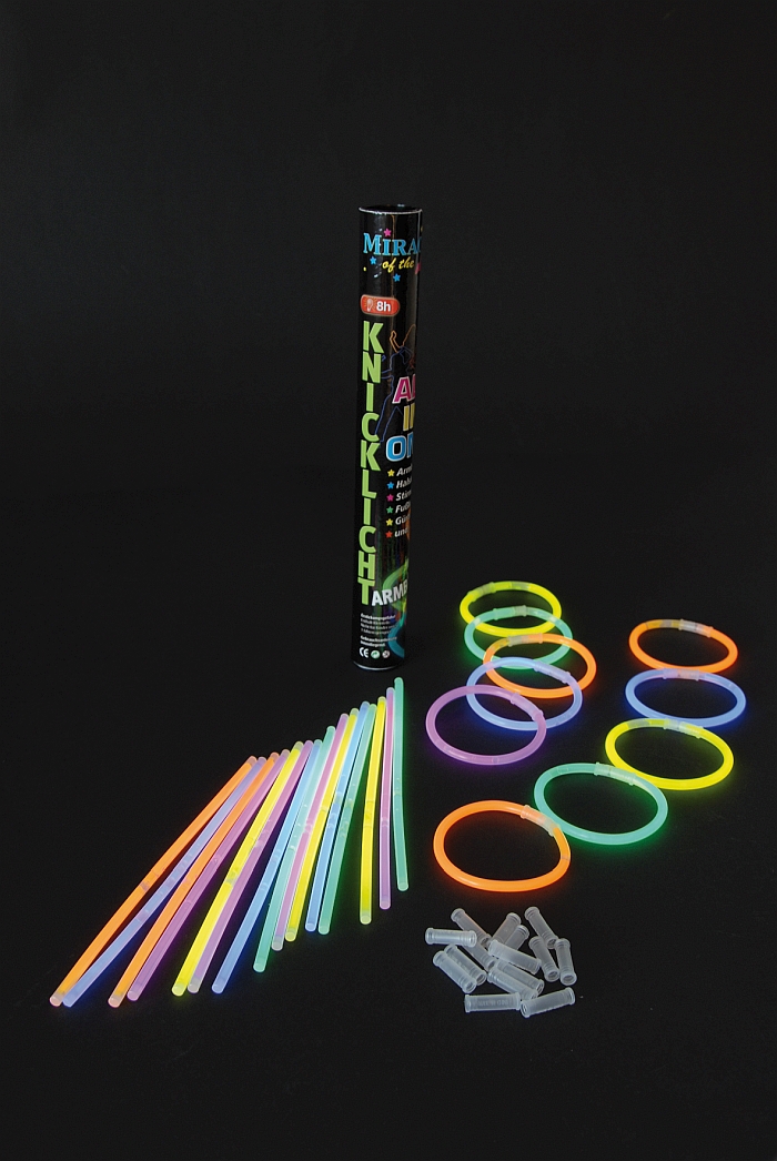 As pulseiras de neon que se pode fazer com o Glow Tubo 25 peças são compostas por uma ampola cheia de água oxigenada, envolta por uma bastão de plástico cheio de luminol. Quando a pulseira é dobrada, a ampola de vidro parte-se e misturam-se as duas soluções. Quando o luminol entra em contato com a água oxigenada, ele começa a oxidar e a emitir luz num processo de quimioluminescência, onde luz é emitida sem a emissão de calor.No entanto, somente no final dos anos 50, começou a utilizar-se este artigo como elemento decorativo de festas. É certamente o artigo ideal para quem fazer uma festa diferente do habitual!