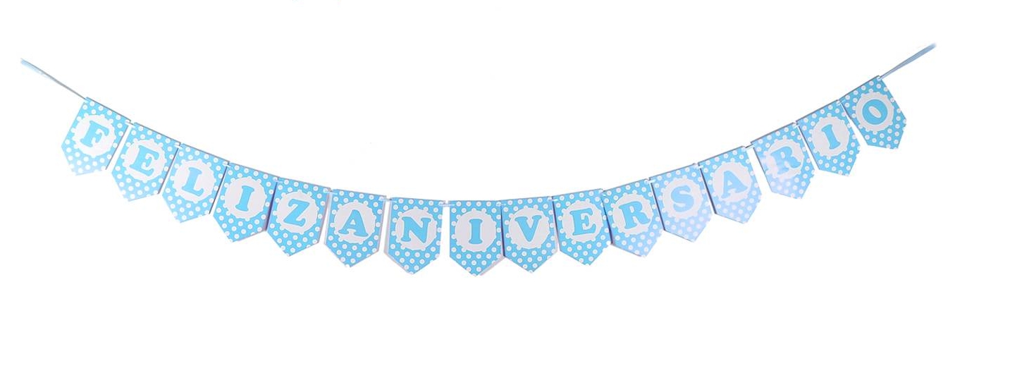 B301846 – Grinalda Papel Bolinhas Azul, “Feliz Aniversário” na cor azul celeste, bolinhas brancas, comprimento 3 metros, altura 16 cm. Artigo de fabrico RPC. Artigo muito utilizado em decoração de festas, principalmente infantis. Também pode ser utilizado em festas temáticas, nomeadamente: frozen, mickey, homem aranha, minnie, princesas e muitos outros temas.