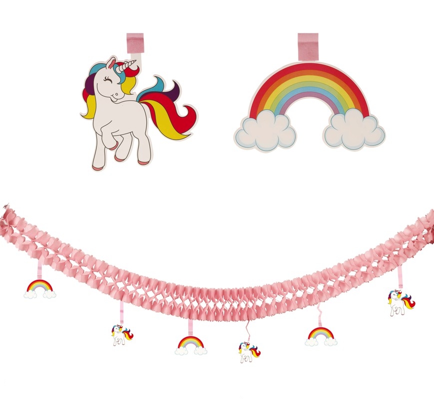 A Grinalda Papel Unicórnio 3m é amplamente utilizada na decoração de portas e paredes. Também pode ser utilizada de modo a criar cenários, tais como cenários de ensaios fotográficos, peças de teatro, mas é principalmente utilizado para decorar paredes que ficam por trás da mesa principal onde se colocam os bolos.