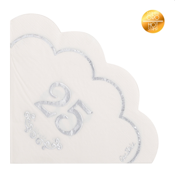 B640.01 – Guardanapos de papel 25 Anos, quadrado, na cor Branco com letras e rebordo prateado, 3 Folhas, 33×33 cm, pack 16 unidades. Artigo de fabrico China da marca GIVITALIA. É certamente a opção mais indicada para quem quer dar um toque especial aos eventos e respeitando sempre o meio ambiente. Artigo muito utilizado em decoração de festas, principalmente em festas dos 25 anos ou em festas temáticas. Também se pode complementar a decoração com balões associados ao tema, tais como o balão foil de ar quente.