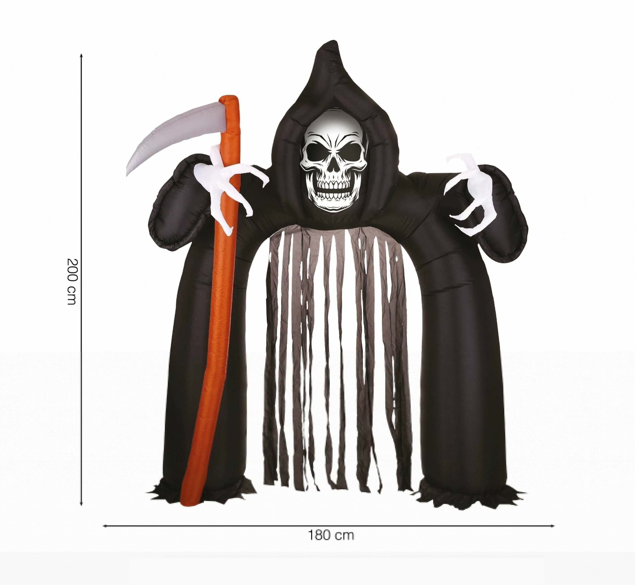 C24782 – Insuflável Arco Esqueleto Morte com Cortina, altura 200cm e largura 180cm. Não possui motor para enchimento. Artigo de fabrico RPC. Artigo muito utilizado em decoração de festas, principalmente de halloween.