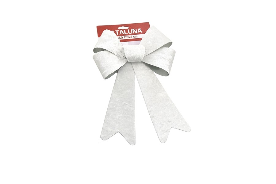 L06967/1 – Laço cor Branco Veludo 1x25cm, comprimento 25 cm, largura 3cm, altura 15 cm, pack 1un. Feito em Veludo. Artigo de fabrico RPC/Itália. O Laço cor Branco Veludo 1x25cm juntamente com as bolas de natal confere à decoração um ar muito encantador, principalmente quando colocado nos pinheiros de natal. Ideal para ser utilizado com o veado branco, gnomos ou com o pai natal. Amplamente utilizado em decorações natalícias juntamente com a cerca de madeira com neve.