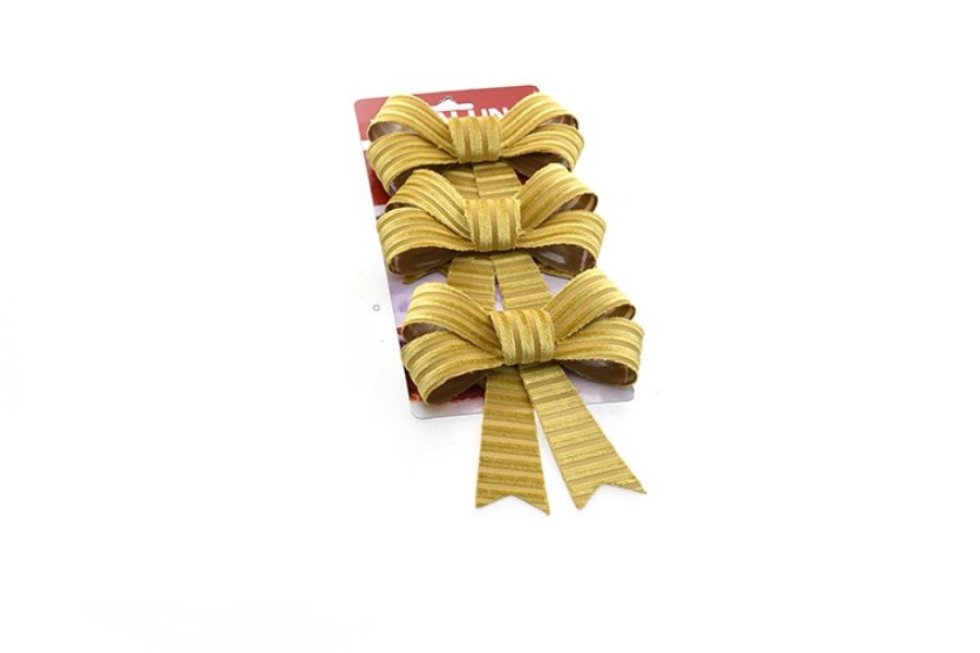 L61180/3 – Laço cor Dourado 3×12.5cm, comprimento 10 cm, largura 2cm, altura 12.5 cm, pack 1un. Feito em PVC/poliester. Artigo de fabrico RPC/Itália. O Laço cor Dourado 3×12.5cm juntamente com as bolas de natal confere à decoração um ar muito encantador, principalmente quando colocado nos pinheiros de natal. Ideal para ser utilizado com o veado branco, gnomos ou com o pai natal. Amplamente utilizado em decorações natalícias juntamente com a cerca de madeira com neve.