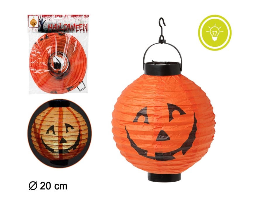 C51538 – Lanterna Papel Luz Halloween, na cor laranja e com as seguintes dimensões: diâmetro 8.5cm, altura 17cm, 1 unidade. Alimentado com 2 pilhas do tipo AAA. Pilhas não incluidas. Artigo de fabrico RPC. Artigo muito utilizado em decoração de festas, principalmente de halloween.