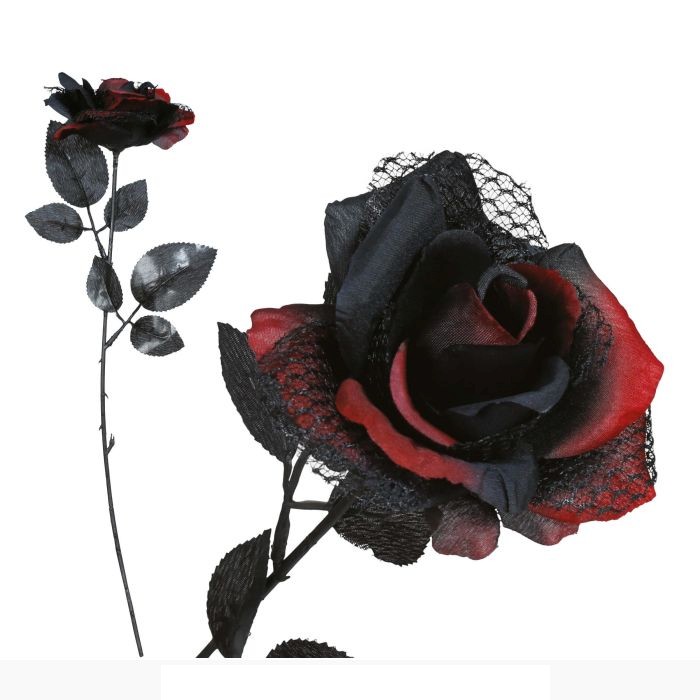 C26941 – Rosa Negra e Vermelha 40cm, feita em plástico (valor unitário). Artigo de fabrico RPC. Artigo muito utilizado em decoração de festas, principalmente de halloween.