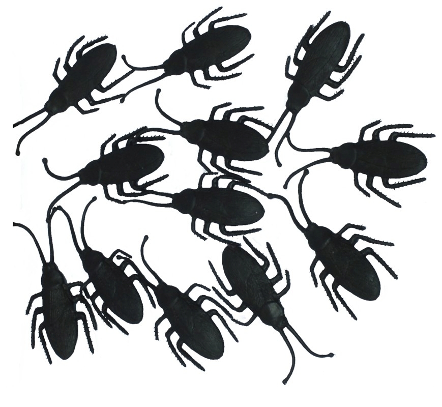 C16825 – Saco com 12 baratas pretas, latex, 7cm. Artigo de fabrico RPC. Artigo muito utilizado em decoração de festas, principalmente de halloween.