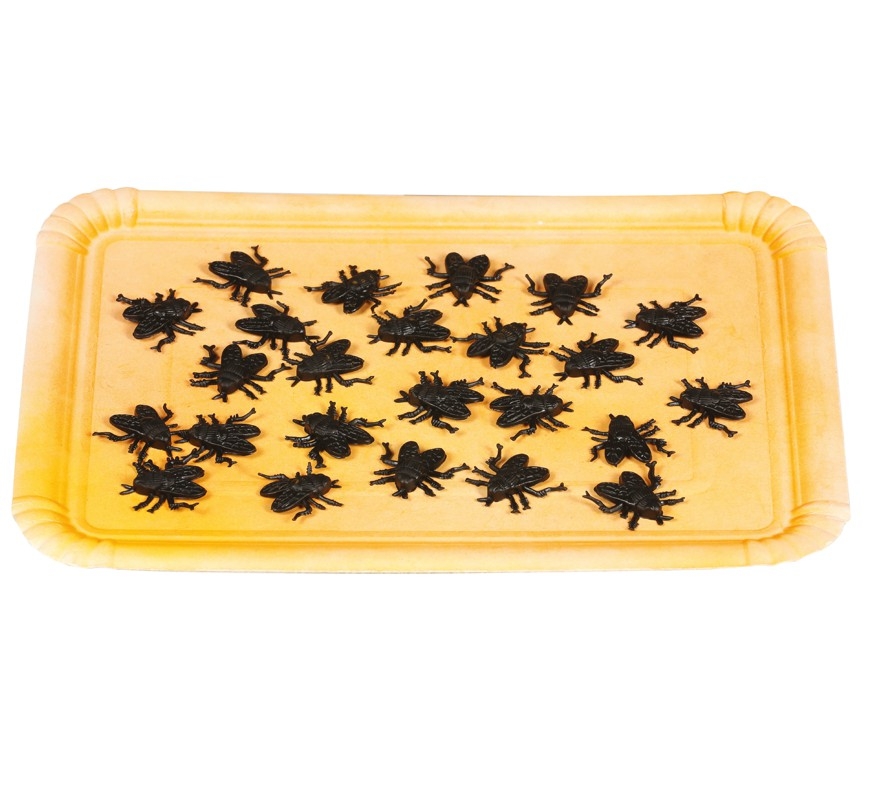 C26180 – Saco com 24 Moscas 2.5 pretas, plastico, 2.5 cm. Artigo de fabrico RPC/Espanha. Artigo muito utilizado em decoração de festas, principalmente de halloween.