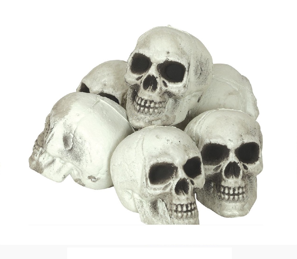 C26975 – Saco com 6 caveiras 8cm, pack 6un. Artigo de fabrico RPC. Artigo muito utilizado em decoração de festas, principalmente de halloween.