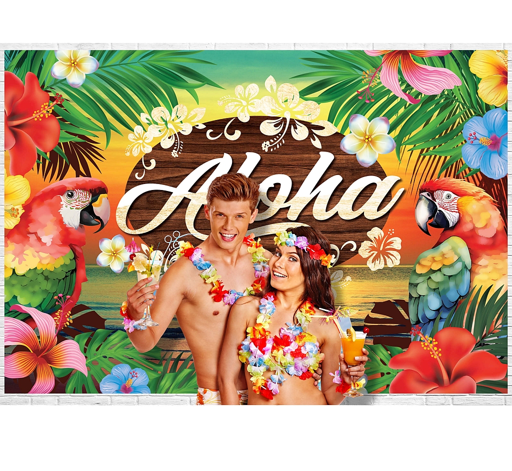 B31060 – Tela Decorativa Hawaii Aloha 220cm, largura 220 cm, altura 150 cm. Artigo de fabrico RPC. Artigo muito utilizado em decoração de festas, principalmente de hawai.