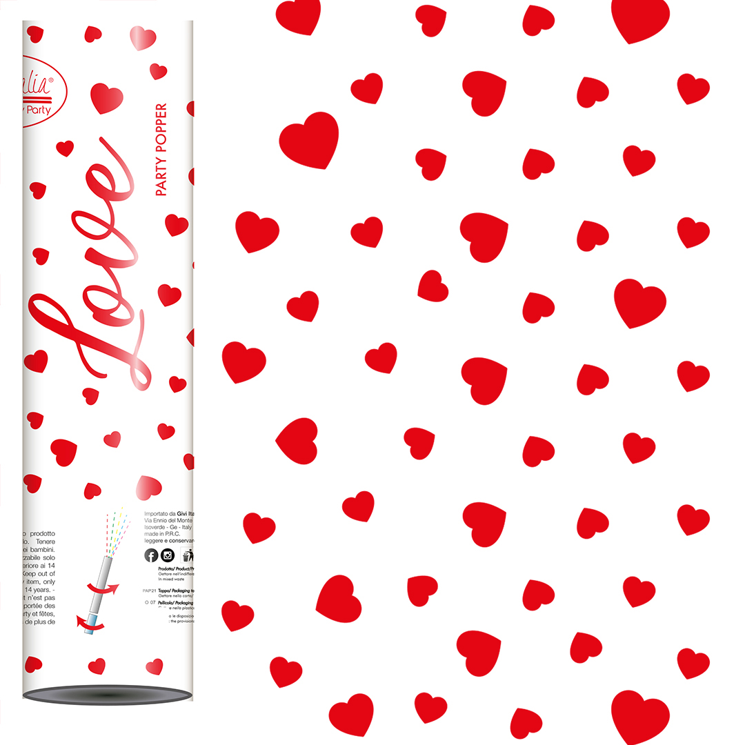 B501.46 – Tubo Lança Confetis Corações Vermelhos 20cm, com confetis formato coração em papel, alcance 1 a 2 metros. Dimensão : diâmetro 4 e altura 20cm. Artigo de fabrico RPC/Itália. Artigo muito utilizado em decoração de festas, principalmente infantis. Também pode ser utilizado em festas temáticas, nomeadamente: festas de final de ano e muitos outros temas.