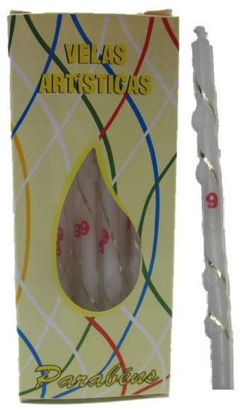 B01244 – Vela Branca e Dourada número 9, com espiral dourada, número na cor vermelha, caixa com 18 unidades, 13 cm. Artigo de fabrico Português. Artigo essencial no bolo de aniversário. Juntamente com outros artigos na loja, tais como: copos, pratos, guardanapos, toalhas e muitos outros. Também pode ser utilizado em festas temáticas, como por exemplo: princesas, minnie, lol, frozen, entre muitas outras.