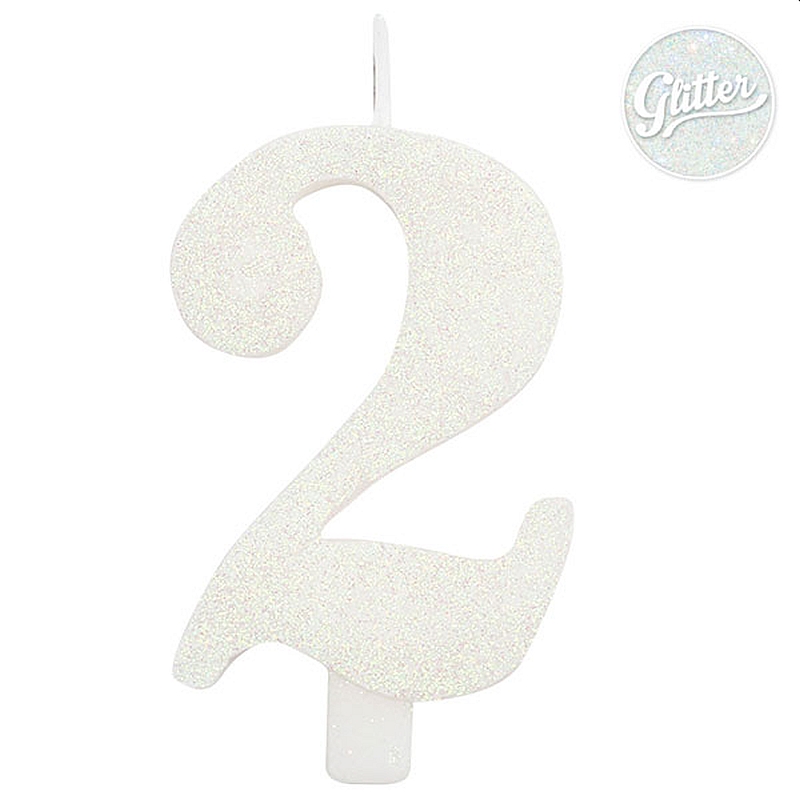 B508.02 – Vela Branca glitter número 2, com suporte de espeto plástico transparente, 9.5 cm. Artigo de fabrico RPC. Artigo essencial no bolo de aniversário. Juntamente com outros artigos na loja, tais como: copos, pratos, guardanapos, toalhas e muitos outros. Também pode ser utilizado em festas temáticas, como por exemplo: princesas, minnie, lol, frozen, entre muitas outras.