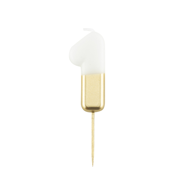 B506.41 – Vela Branco e Dourada número 1, com suporte de espeto madeira, 8 cm. Artigo de fabrico Itália/RPC. Artigo essencial no bolo de aniversário. Juntamente com outros artigos na loja, tais como: copos, pratos, toalhas e muitos outros. Também pode ser utilizado em festas temáticas, como por exemplo: minnie, princesas, frozen, entre outras.