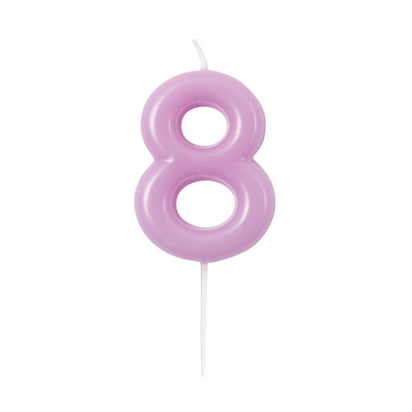 B500.48 – Vela Lilás Glossy número 8, com suporte de espeto branco, 10.5 cm. Artigo de fabrico RPC da marca GIVITALIA .Artigo essencial no bolo de aniversário. Juntamente com outros artigos na loja, tais como: copos, pratos, toalhas e muitos outros. Também pode ser utilizado em festas temáticas, como por exemplo: minnie, princesas, frozen, entre outras.
