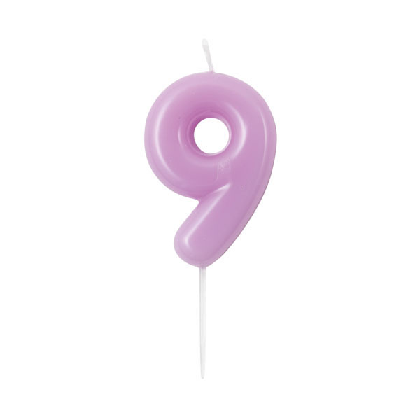 B500.49 – Vela Lilás Glossy número 9, com suporte de espeto branco, 10.5 cm. Artigo de fabrico RPC da marca GIVITALIA .Artigo essencial no bolo de aniversário. Juntamente com outros artigos na loja, tais como: copos, pratos, toalhas e muitos outros. Também pode ser utilizado em festas temáticas, como por exemplo: minnie, princesas, frozen, entre outras.