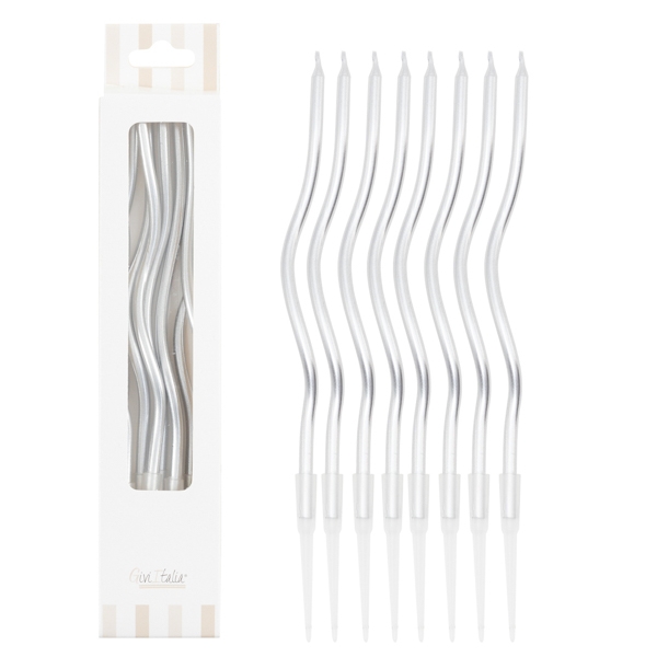 B531.65 – Vela Ondulada Prateada, 8 unidades, 12.5 cm. Artigo de fabrico Itália/RPC. Artigo essencial no bolo de aniversário. Juntamente com outros artigos na loja, tais como: copos, pratos, toalhas e muitos outros. Também pode ser utilizado em festas temáticas, como por exemplo: mickey, patrulha pata, entre outras. Artigo muito utilizado em cake design.