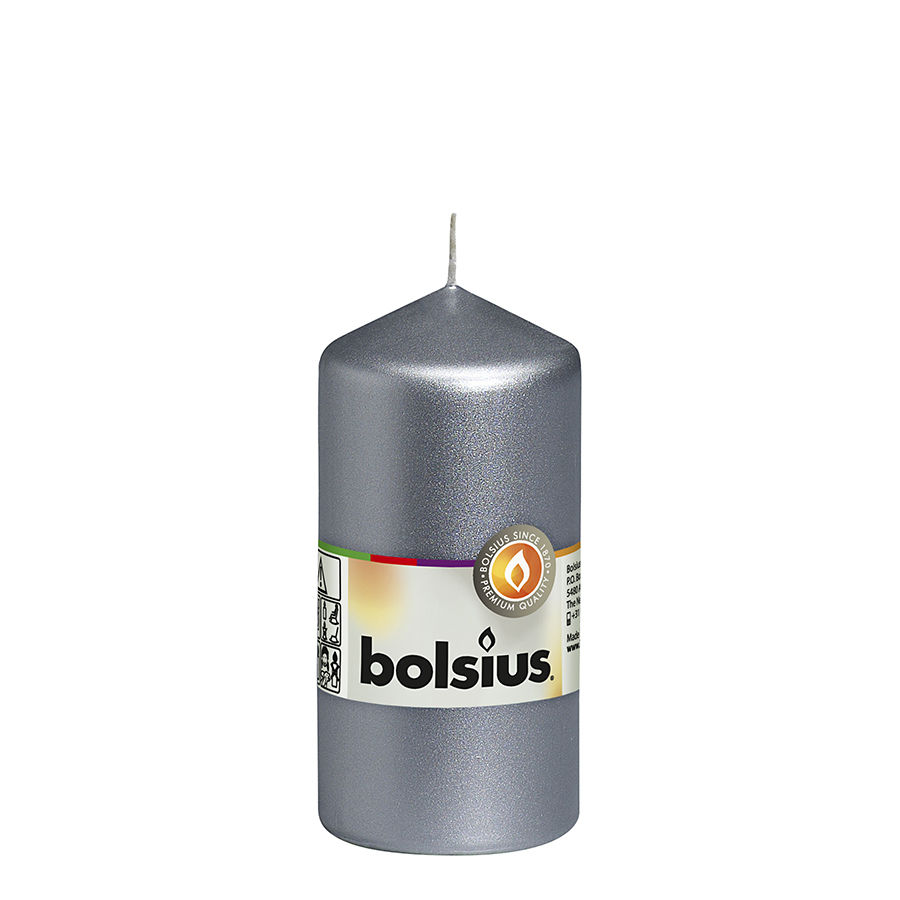 L90181 – Vela pilar redondo Prata 120, pilar, com as dimensões: altura 12.0 cm, diâmetro 5.8 cm. Artigo de fabrico holandês, da marca Bolsius. Este artigo é vendido à unidade. É inegavelmente um artigo indispensável para a decoração de mesas de natal, festas cujo tema é o dourado ou Dia dos Namorados.